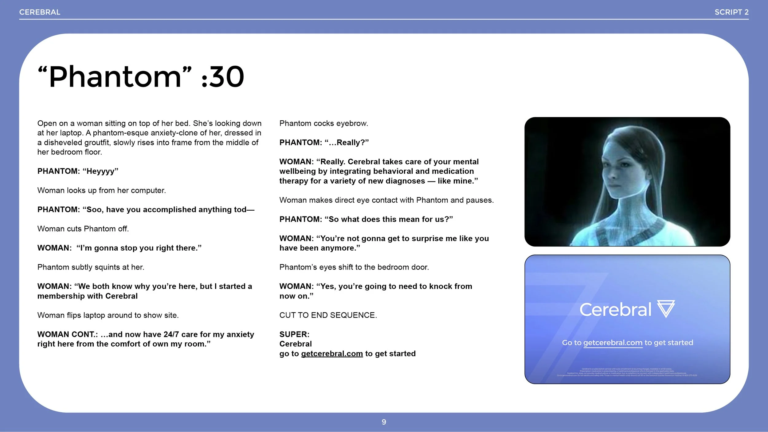 Cerebral launched on TV with testimonial footage that is performing well, but their service offering has since expanded. I had the opportunity to depict the new offerings through a fresh creative direction. Both scripts focus on Cerebral coming across as a supporter to improve your life, not a strict manager or simple solution. “Support” is a safer, more grounded direction and “Phantom” goes into magical realism.